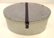 DescriptionBlack silk top hat, brim bound in grosgrain ribbon. Wide wool felt band around crown. Inside ecru silk with wide band of oiled cloth. Box: oval shaped, covered in silver paper. Snap strap across cover that makes into a handle. Drawing of plane on cover.On View