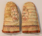 DescriptionLeather with painted designs. Bands of geometric and curvilinear motifs in red, dark green, and brown on light background. Tan strips divided by red and brown lines on inside. Thumbs painted with hatched diamonds. Very soft and thin. Unlined.On View