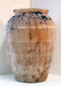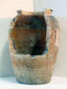 DescriptionShades of beige, horizontal grain. Hat rim/neck. Short sloping shoulder tapering to flat bottom. Oblong protruberances on either side below shoulder.On View