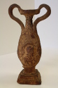 DescriptionVase with small neck. 2 large handles on stand. Shape crude but carved relief of helmeted head and chariot driver whipping horses.On View
