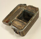 DescriptionBrass betel box, inlaid with silver, used for betel nuts and lime for chewing. Handles at sides, three compartments inside, two covered. Top hinged, compartments hinged, mosaic design on top corners cut of so "eight sided". Design on sides of diamonds and triangles inlaid with silver.On View