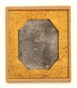 Matted with gold pebbled surface, rectangular, octagonal, brown tape holding glass and metal. No frame