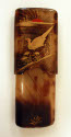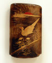 DescriptionTortoise shell- with gold and red paint, gilded design with bird in landscape and red sun, opposite a flower and butterfly. In two pieces, cover slides down almost covering inner portion.On View