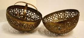 DescriptionLamp encased in brass cut out sphere, ship's lamp that stays upright-Floral and foliage designs engraved.