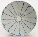 DescriptionWhite with blue, flares out from base. Inside has design of loops up from center circle. Outside design is peacock feather, pheasant feathers, and floral medallions.On View
