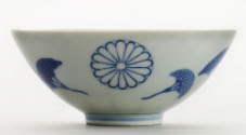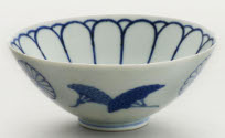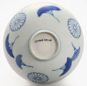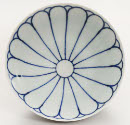 Descriptionwhite with blue, flares out from base. inside has design of loops up from center circle. outside design is three medallions and flowers.