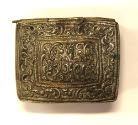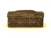 DescriptionSmall rectangular white metal box with hinged cover. Some silver in metal. Foliage design in repousse.On View