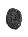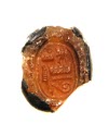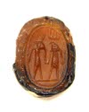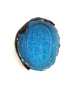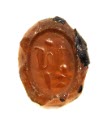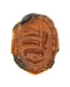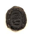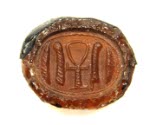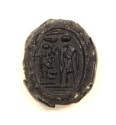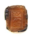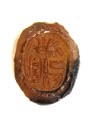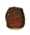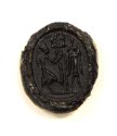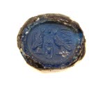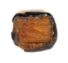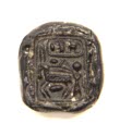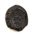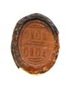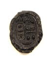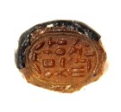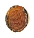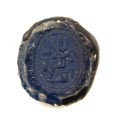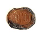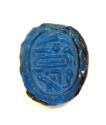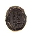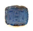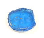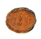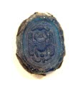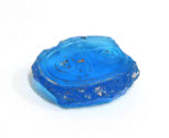 Description31 Stamped pieces of glass. 16 pieces in amber/brown, with black encrusted edges. Ovals from 2.2 to 2.9 cm. Two small and one large rectangle - 1.9cm, 2 cm, and 2.2 cm. Motifs of bugs, vials, etc. Seven blue pieces in oval, round and rectangular shapes. Eight pieces in black, one rectangle, remainder oval.On View
