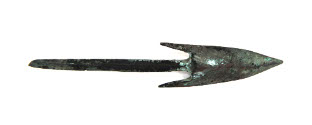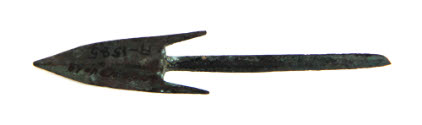 DescriptionSmall, median ridge on both sides that ends in triangle. 2 retreating barbs- metal shaft. Point: 3.7 cm