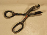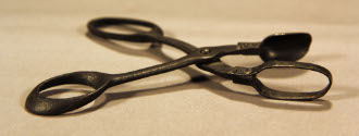 Metal lighter has two differently shaped handle holes. Lighter is held together by a bolt. Ends of the lighter have two pieces attached by two bolts each. One end resembles a shovel or pan, while the other is an oval-shaped ring.