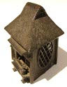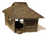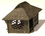 DescriptionBrass model of Japanese home, painted black. Parallelogram. occupied by 2 people having dinner. Straw-like roof-barred windows-stone step. Robe fringe in doorway.