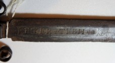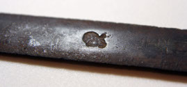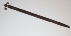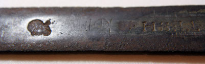 DescriptionStraight doubled-edged blade. "Peter Tesh" engraved on both sides of blade. Moor's Head (Mohrenkopf) mark stamped on both sides, and lightly incised ReichsΣpfel, "a stylized representation of the imperial orb and cross." Both common marks used by Solingen blade makers. Pas d'anes curved down on both sides, probably a later adaptation.On View