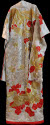 DescriptionWorn unbelted over a matching kimono, this kind of formal outer garment (uchikake) is still part of traditional wedding attire in Japan. In a commercial practice begun as early as the mid-17th century, clients perused pattern books and fashion magazines before settling on a color scheme and design appropriate to the season and occasion. In this example, white, the color associated with beginnings, is combined with cranes, pine trees; and plum blossoms, traditional symbols of longevity and prosperity.