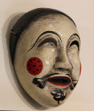 DescriptionWhite mask with red and black detail. Arched, thin eyes with black arched eyebrows above them. An open mouth, displaying black teeth, and red, thin lips surrounding them. A black mustache sits above the lips and curves down around the corners of the mouth. Red circles, filled with black dots, are on each cheek, and there is a black band around the top of the head.On View