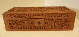 DescriptionCarved sandalwood box w/ key & leaves inside. Unpainted. Carved on four sides and top with scenes of people playing games, chatting in a pavilion, cruising the river, and enjoying the garden.On View