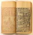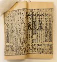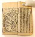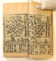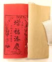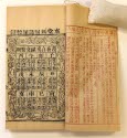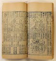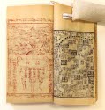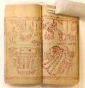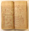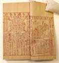 DescriptionBook of monthly script, some wood cut scenes in black, red and blue. A red section of constellations. Double pages - Heavier paper cover-fastened with natural cord red panel on front with script.