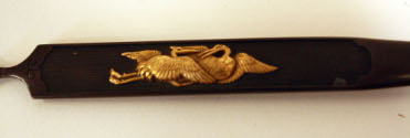 DescriptionA Japanese knife perhaps a sword knife, two raised birds at handle. Dark metal with two gold cranes.On View