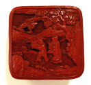 DescriptionCinnabar box w/ lid. Early 19th c. square with rounded edges design of 2 figures in landscape on lid.On View