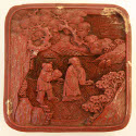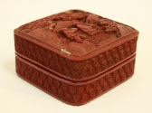 DescriptionCinnabar box with lid. Red in color on the outside, black on bottom and inside. Bottom and lid sides carved with a repeating, goemetric pattern. Top of lid carved into a scene with two people in a wooded landscape. Lid fits over bottom perfectly.On View