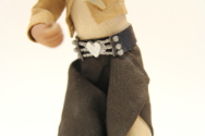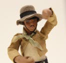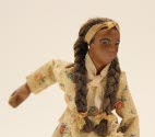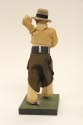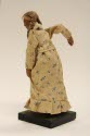 DescriptionCarved of wood on stands. Female has 2 long braids, 2 piece flowered dress, lace apron, silk scarf at neck, left hand holding shirt up, right arm in air. Dancing. Man wearing hat, chaps over fringed trousers, belt with metal buckle and studs, one spur, scarf around neck, left arm in air.On View