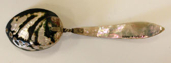 DescriptionSpoon of abalone? shell, row of tiny holes along upper portion of shell, riveted to abalone shell handle with twisted silver fastener.On View