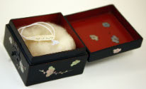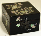 DescriptionBlack trinket box inlaid with mother-of-pearl in flower design, red lacquer interior, metal clasp and hinges.On View