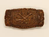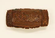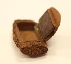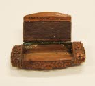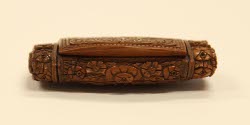 DescriptionBox flattened barrel shape, intricately carved, sandal wood? Lid fastened with brass hinges. Mostly craved in floral motif, but medallion on bottom has crossed container, one with feathers, one with brushes.