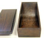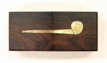 DescriptionWooden box, rectangular, cover angled. Inlaid on top is a mother-of-pearl pipe. Inside of box shapes to center.On View