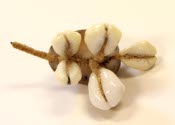 DescriptionBack of brown shell, feet and head of a small white shell, held together with pipe cleaner. Tail end of pipe cleaner. Cowrie shells.On View