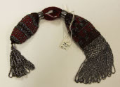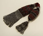 DescriptionMiser's purse of crocheted cotton and steel beads. Cranberry red with maroon stripes. Steel bead tassels on ends. Two rings. Beaded in squares. Square end has beaded "knot work" with looped fringe. Rounded end has two tassels of beads and twisted steel bugle beads.On View