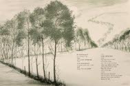 DescriptionHorizontal-with lines of trees going off into the distance in green and charcoal. Poem printed lower right in two columns.On View