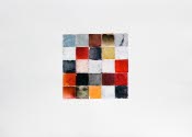 DescriptionBox: Gray speckled box, black print center front, "Snow and Wounds: The Winter Suite 2004-2005 October, November, December, January, February, March. Monotypes by Bill Davison published and selected by J. Brooks Buxton" Inside a description page, black ink on white paper. Print:Equal sided square made up of smaller squares, each measuring 5 cm x 5 cm. Each square is of a different color/ texture. Signature in lower left, below image, in pencil. The image is set in the center of the paper. The paper is white, slightly textured with a styled fray/ ripped edge. Slight red smudge about second box in top row. (intentional?)