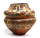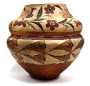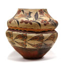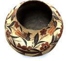 DescriptionCeramic vessel with thin walls. Decorated with vegetal motifs with four birds along top band which droops/sags slightly to the side. The top band is divided from the rest by the physical indentation as well as two painted bands. Below the vessel is decorated with more of a geometric motif, circulating in the same pattern thoughout. Black, white/grey, red, orange and brown paint or glaze is used for the motifs as well as the solid color bottom and inner rim.