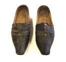 DescriptionBlack, wooden, with leather strip riveted on making the vamp longer.On View