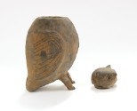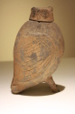 DescriptionUnglazed pottery vessel in shape of owl with cover for head. Stout body supported by two thin legs and short tail. Red-tan with grey flecks. Scoring designates wings. Slightly raised "spine" line continues underneath and up center of breast. Eyes are round with short radiating lines.On View