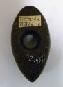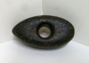 DescriptionOval-shaped pointed at the outer edge. Slightly concave surface on one side top or bottom the full length of the stone. There is a hole drilled through the center, like a donut. Ground stone tool.
