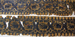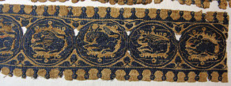 DescriptionA Coptic garment with a tapestry ornament. Only the tapestry piece of twenty two round circles in dark blue on a once-white background. In the circles are many different kinds of dragon-like animals. Bust of a man at one end. Crenalated design on border. Three pieces were sewn to backing as one.