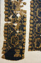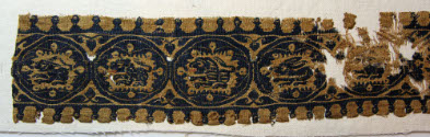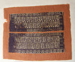 Description1. Portion of sleeve, wool, tapestry woven. Rust background all around. Two bands woven in grotesque figures in black on white background.Edge has several holes, some holes in tapestry.