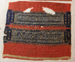 2. Portion of sleeve. Two bands of wool tapestry weave on red background. Red on top and bottom and separating bands from selvage to selvage. Bands are blue with white geometric pattern. Narrow white band on bottom.