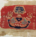 DescriptionA decorative band from a garment. The background of the design is red and the res is on a natural course cloth, the design is three grotesque figures in black, orange, red, light green, and a natural (which might have been white).On View