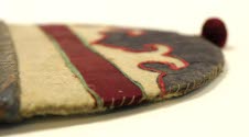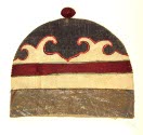 Felt, metallic, red satin; hand sewn - shaped like a tea cosy. Red satin pom pom, monks-cloth lining.