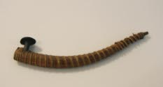 DescriptionLong, thin wooden pipe with a gentle curve. Diameter of pipe grows larger from mouthpiece to bowl. Carved of two pieces of wood and bound together by a wrapping of a thin strand of rawhide. Pipe bowl is made of stone and is bound to the stem with rawhide strips. The bowl's edges are flat and flare widely.On View