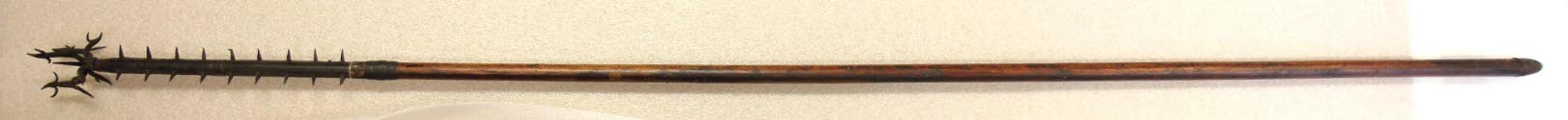 DescriptionCombination hook and spear with barbs. Wooden handle.
