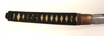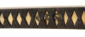 DescriptionSharkskin pebbled grip. Handle cord over white stones; on each side a dragon interwoven under a black cord; copper end on slightly curved low steel blade.On View