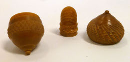 DescriptionTan color, carved in shape of acorn. Elaborately carved in diamonds and swirled barred lines. Thimble carved with 2 bands of diagonal lines and crown of rough horizontal lines. Tiny knobs on top and bottom.On View