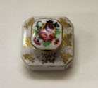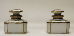 DescriptionOne of pair of china perfume bottles. The bottoms are square with floral design on the shoulders in gold. The square stoppers have bouquets of flowers painted on the tops.On View
