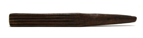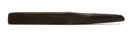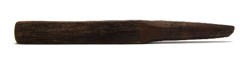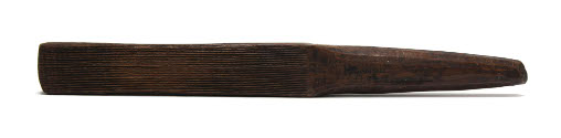 DescriptionDark wood, round tapering handle, beater portion squared with different width indented striations on each side running lengthwise, grip end beveled.On View