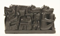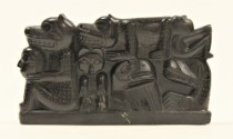 DescriptionBear at one end is sitting up with chin resting on the head of a woman with her back to him;against bear's back are 2 cubs depicted with exposed ribs; another bear is horizontal with nose at the back of the first bear's head, chin resting on the head of a bird with large curved beak; bird faces a bear like animal with no ears and joints of front legs in form of typical eye motif; flippers are in place of paws; on head of the last animal is a person with hands on knees, head tipped back and facing straight upOn View