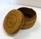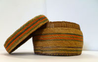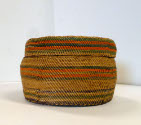 DescriptionRound, flat bottomed, wrap twined basket with lid. Natural color on top and sides with horizontal stripes of orange, dark green, light green and purple in aniline dyes. The bottom is cedar bark in a coarser weave. Cedar bark below rim.On View