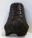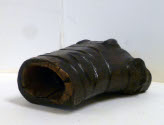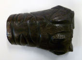 DescriptionBone is hollow at the narrow end and is open and lined with copper. Copper extends into the interior and covers about half of the hollow cavity. At the wide end there is some superimposed wear and carving. The entire front is decorated with a linear pattern in low relief. Back of object has no decoration. In the middle of the back side there is a small hole which is uniform in size and extends through the wall of the bone -probably where the pipe stem would be located. The bone is very dark and hard and the surface is quite glossy - possibly treatedOn View